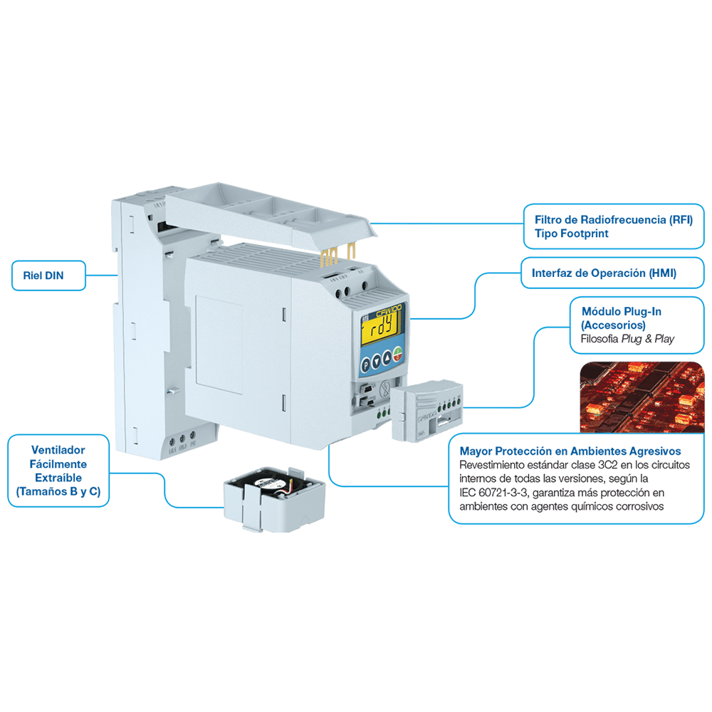 Rango de potencia: 0,18kW, 0,25kW y 0,75kW (0,25, 0,50 y 1,0 HP) Monofásico Tensión de Alimentación: 200-240 V Control Escalar (V/F) y Vectorial (VVW) Capacidad de Sobrecarga: 150% de la corriente durante 60 seg. Filtro RFI externo (accesorios) Temperatura Ambiente: -10 hasta 50 ºC (14 hasta 122 °F) Todas las tarjetas electrónicas son barnizadas (conformal coating) clasificadas como 3C2 de acuerdo con la normativa IEC 60721-3-3 Grado de protección IP20 HMI incorporada (Indica hasta 2 parámetros al mismo tiempo) SoftPLC disponible como estándar en el producto Módulo de memoria flash: Utilizado para descargar la programación existente de un CFW500 en otros sin la necesidad de energizarlos Módulos Plug-in: I/Os, USB, Bluetooth®, Infrarrojo y redes de comunicación Fieldbus Protocolos de Comunicación: Modbus RTU (RS-485) y CANopen WLP y SuperDrive G2 – Software gratuitos