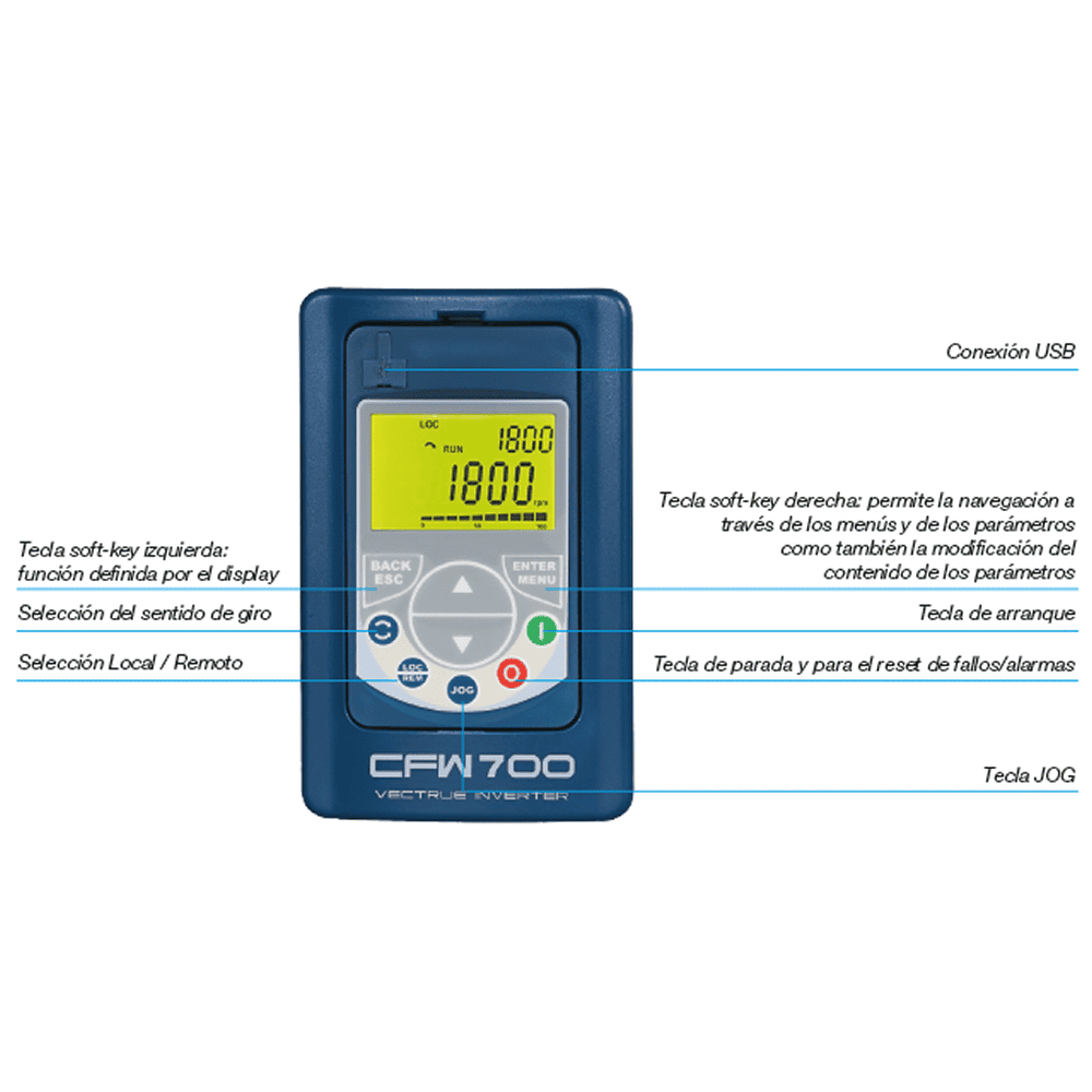 Vectrue Technology® Optmal Flux® – Flujo Óptimo Optmal Breaking® – Frenado Óptimo Inductores incorporados al Bus CC Interfaz de encoder incremental 8 entradas digitales y 5 salidas digitales Protocolo de comunicación Modbus-RTU Puerto USB Conformal Coating (Tropicalización) Bus CC Común Gestión Térmica Inteligente