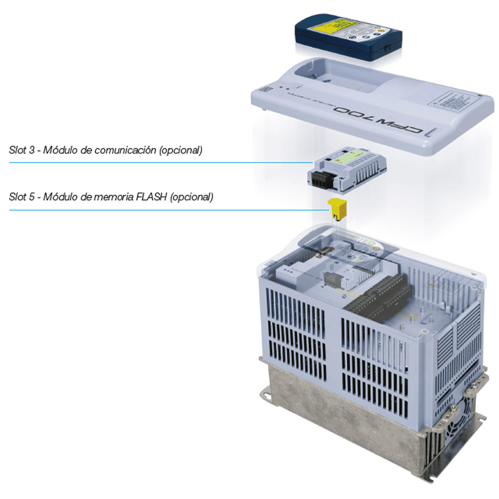 Para adicionar accesorios al CFW700 no es necesario ninguna configuración adicional, pues él es basado en la Filosofía Plug and Play, ahorrando tiempo y le permitiendo rapidez y facilidad al instalar los módulos.